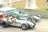 A shot of the pits before the (1969?) Oswego Classic. The Bhenke Trucking red #60, the white #2 "little deuce", Ollie Silva.